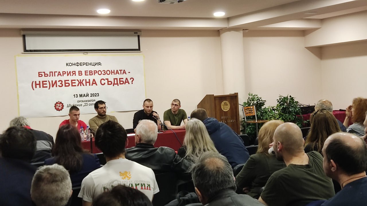 Четвертое. Благодаря самоотверженному и активному участию Движения «23 сентября» в борьбе против вступления Болгарии в еврозону, коммунистические символы и идеи начали выходить из маргинальности. Как вы знаете, после реставрации капитализма в 1989 году последовали тяжелые годы для коммунистов во всей Восточной Европе. Во многих странах проповедь коммунистических идей и даже использование коммунистических символов запрещены законом. Не легче положение и в Болгарии по этому вопросу. Однако сейчас у нас есть повод для оптимизма, и мы видим положительные изменения. Все больше людей, причем молодежь, откликаются на призывы к классовой борьбе и упразднению капитализма.